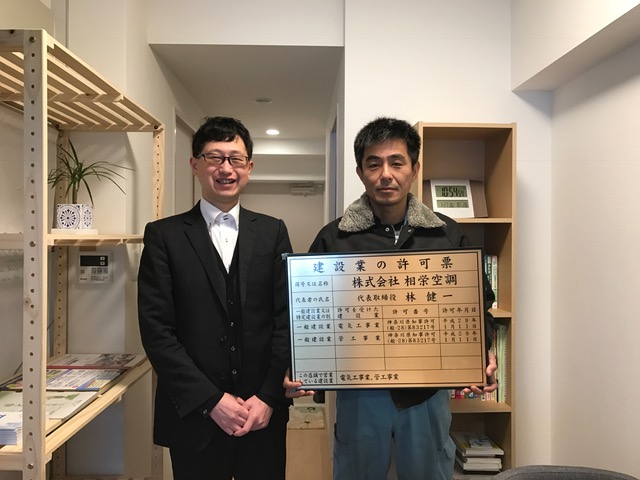 直接自社まで足を運んで資料を確認して頂いたり、許可看板もサービスしてくれて、本当に依頼して良かったと思います。次は電気工事業の許可も取りたいと考えていますので、今後ともよろしくお願い致します。